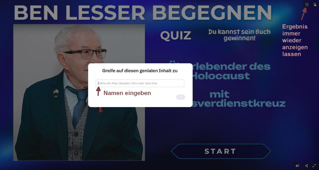 01 Startbild – Gib deinen Namen ein und lass dein Ergebnis anzeigen.